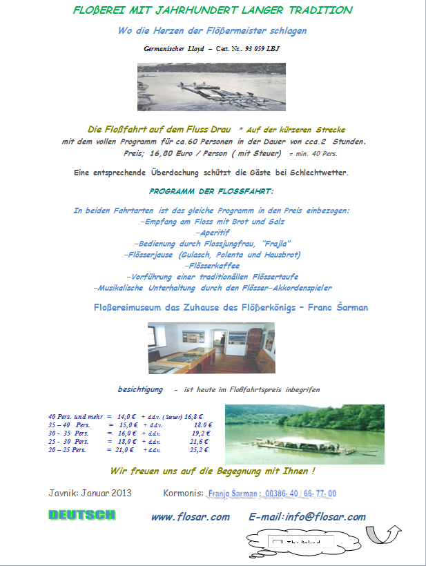 Heutzutage präsentieren die Floßfahrten mit uns – der jungen Flößergeneration von Drau, eine von der wesentlichen Attraktionen und Erlebnisse in dieser Gegend von Europa. Neckisch und spitzbübisch waren unsere Großväter – so sind heute auch wir.