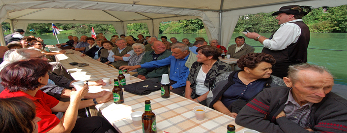 s skupino splavarjev, flosarskimi muzikanti in flosarsko frajlo
